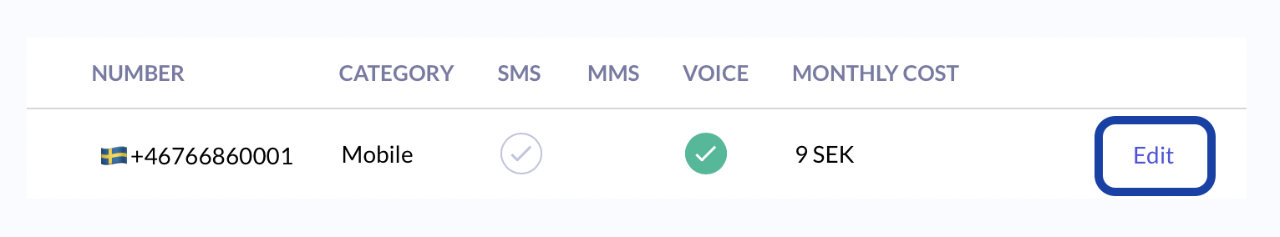 3. Klicka på edit bredvid ditt virtuella nummer i listan.