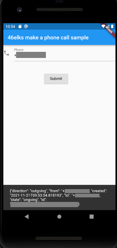 After submitting, you will receive the status of your phone call from the 46elks API. The owner of the phone number you entered earlier (presumably yourself), will receive the phone call on their physical device and have an audio file played to them.